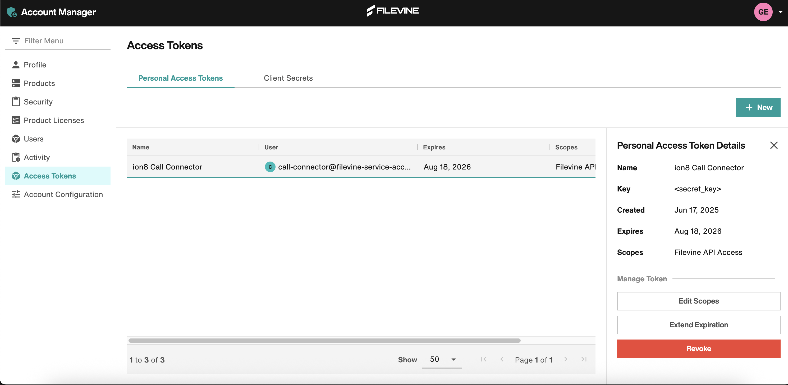 By default, your Filevine PAT will expire after three months. You can see the expiration date of your access tokens on the Access Tokens page.