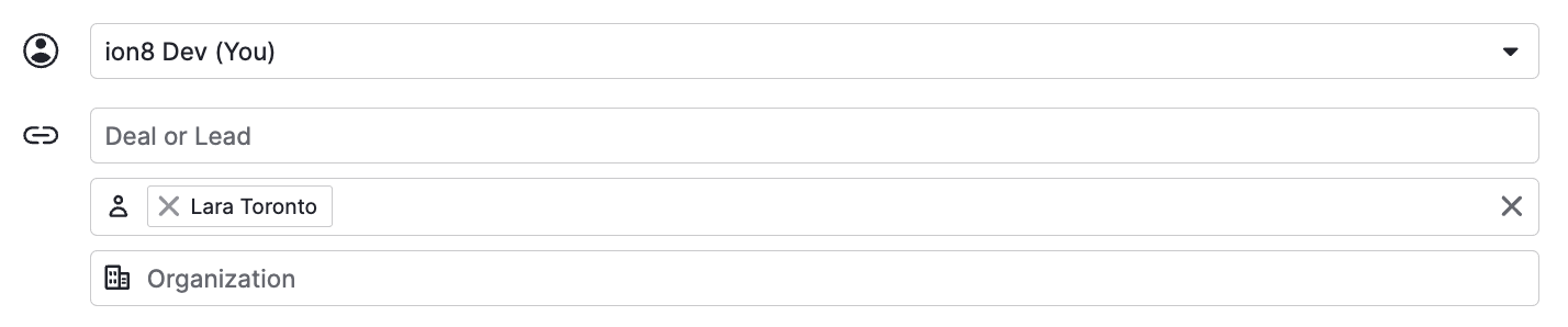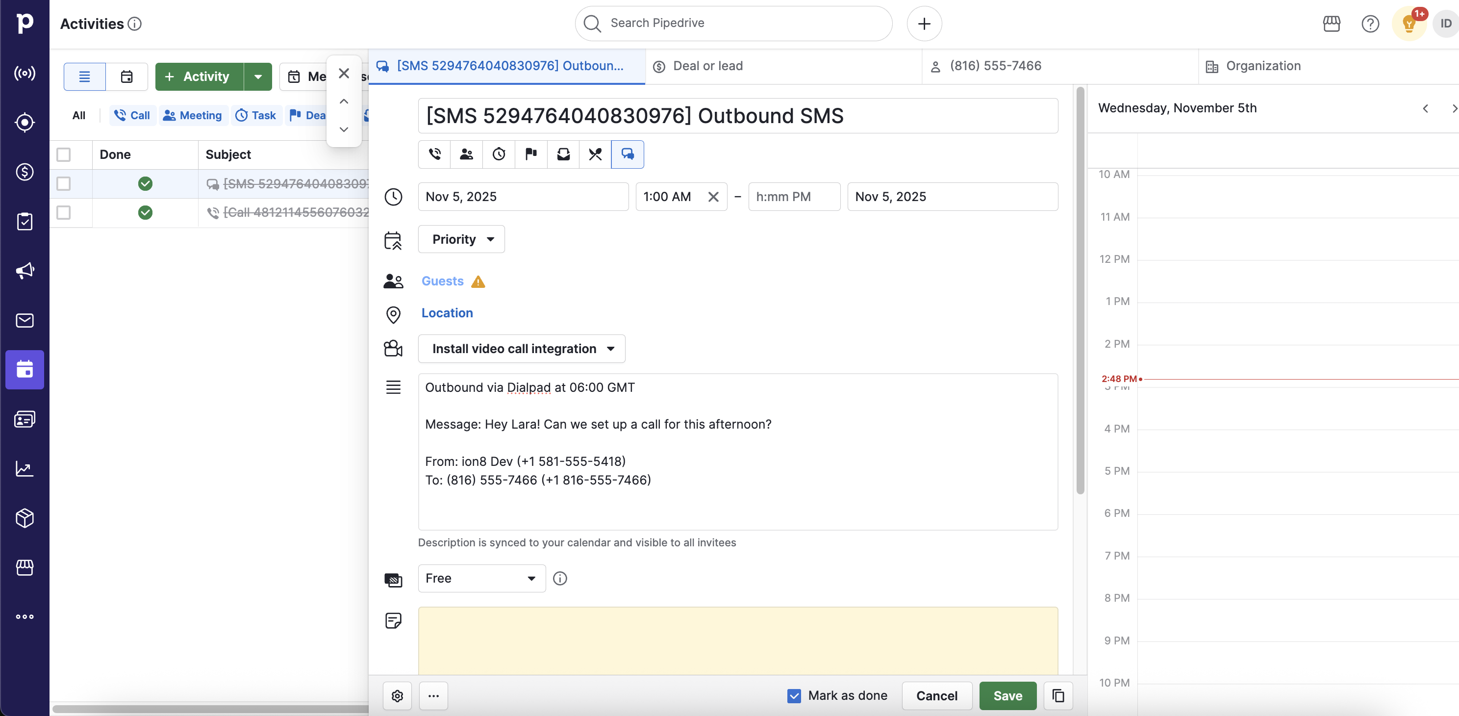 Call in Pipedrive, associated with a user and a contact.SMS