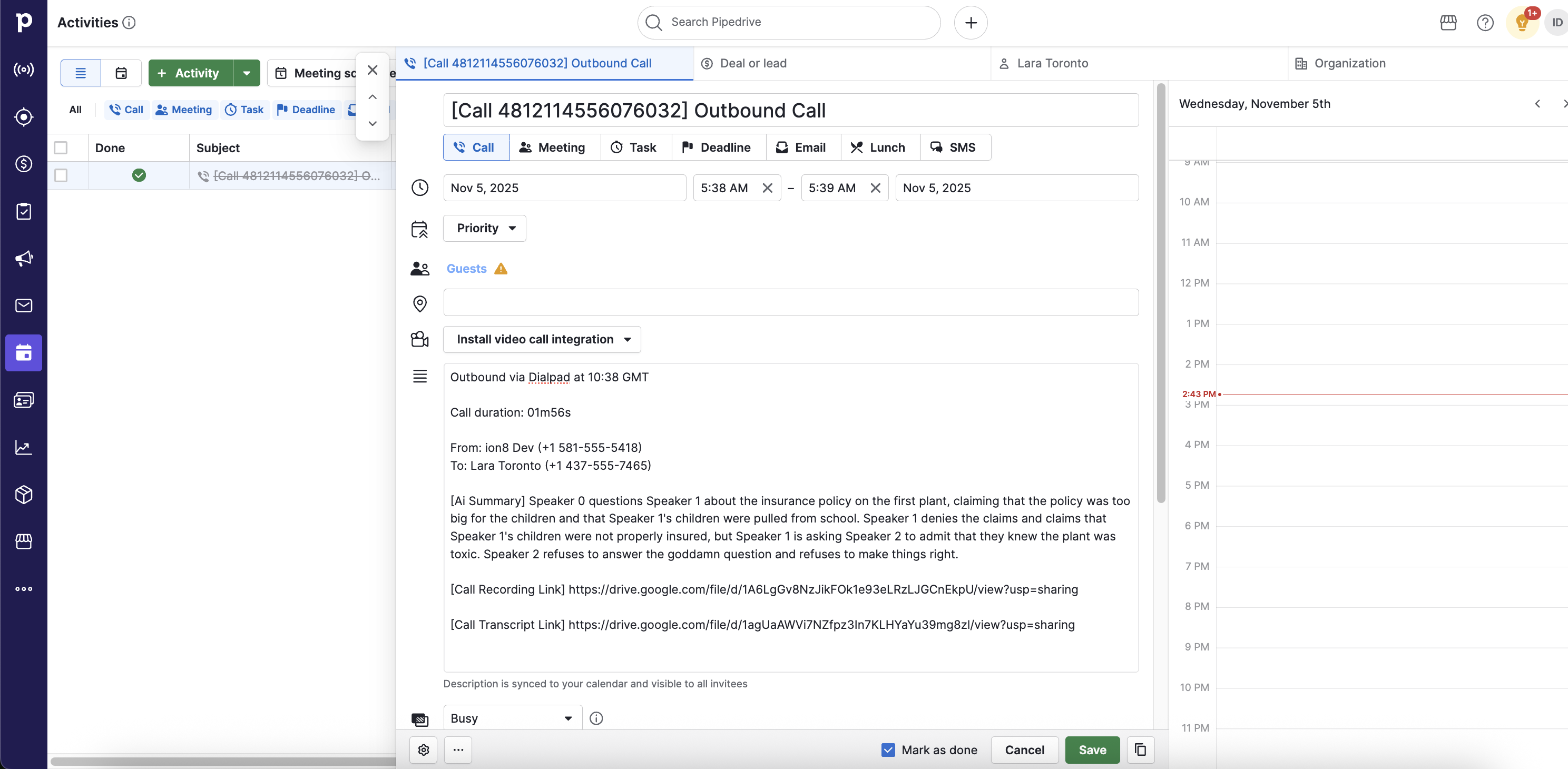 Call logged as an Activity in Pipedrive.