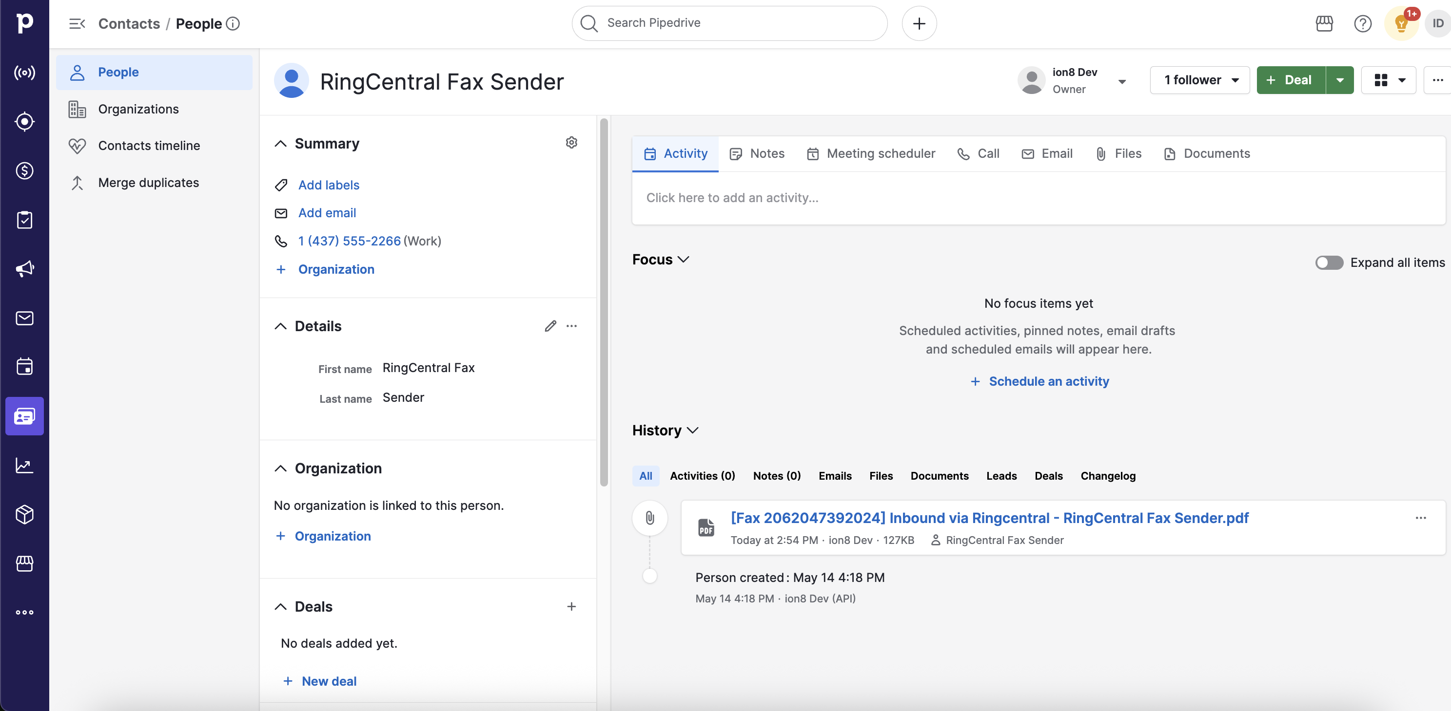 Fax logged as a File to a Pipedrive contact.